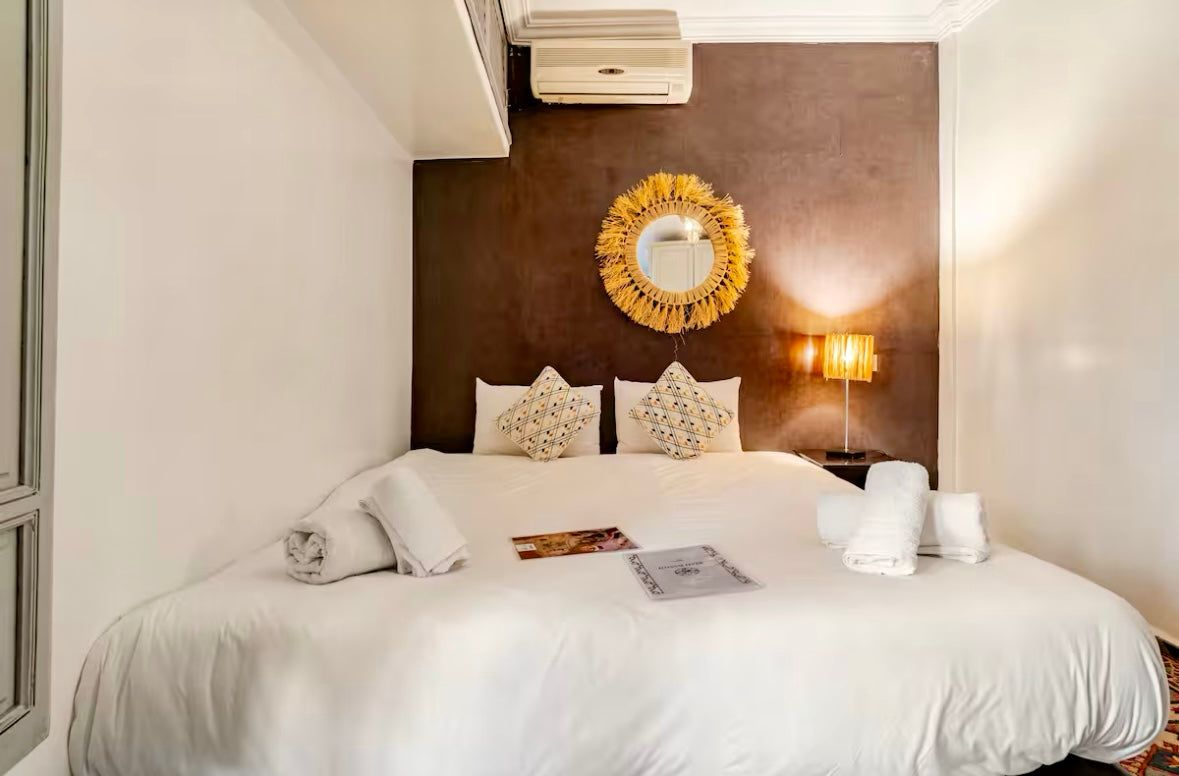 Le lit king-size à la literie généreuse vous accueille pour des nuits paisibles, dans un décor où se mêlent élégance artisanale et touches contemporaines. Un miroir orné de fibres naturelles, des coussins aux motifs berbères et des meubles en bois sculpté viennent sublimer l’espace avec sobriété et caractère.